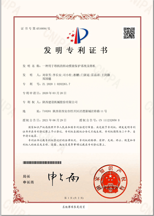 近日,陜建機股份公司《一種用于塔機的轉動慣量保護系統及塔機》獲國家知識產權局頒發的發明專利證書。