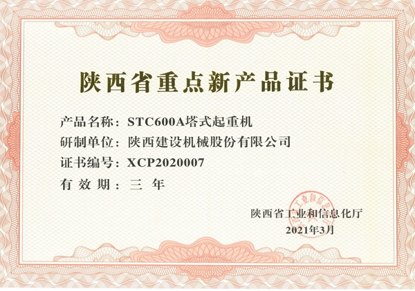 日前,陜西省工信廳下發通知,揭曉省重點新產品認定名單。陜西建設機械股份有限公司自主研發的STC600A塔式起重機被認定為“陜西省重點新產品”。