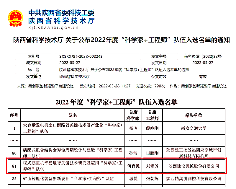 陜建機股份校企聯合研發團隊入選陜西省2022年度“科學家+工程師”隊伍