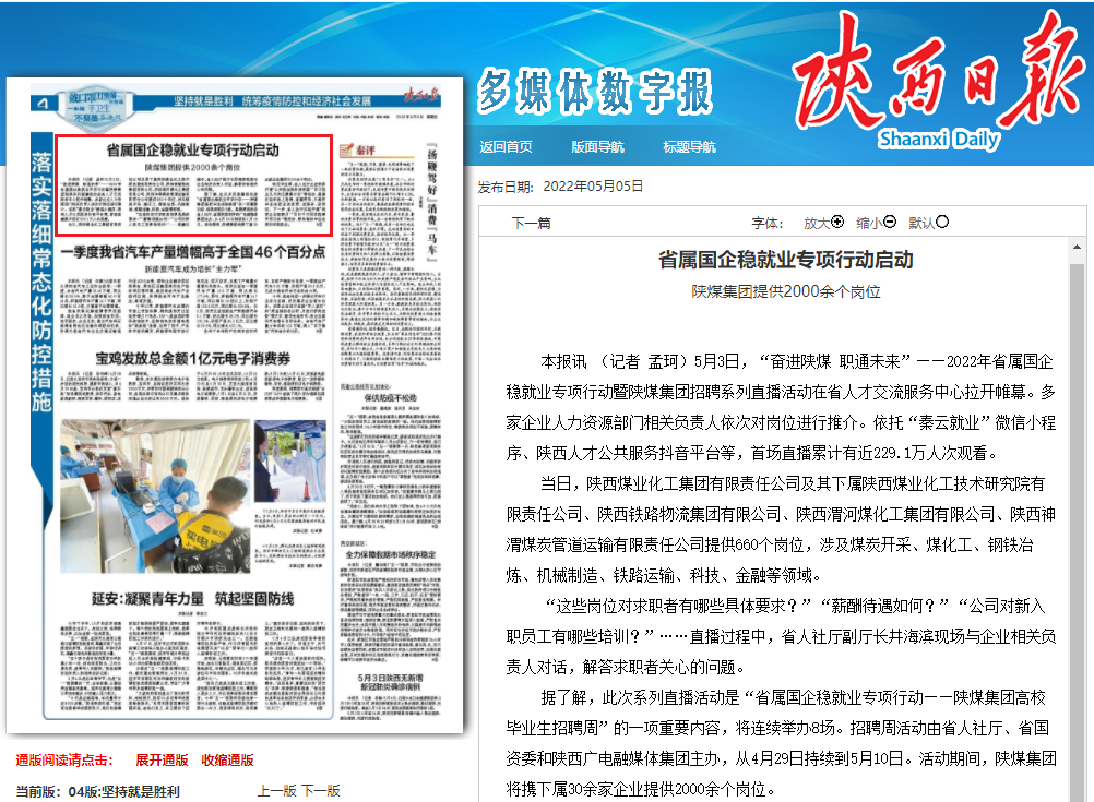 陜西日報 | ?省屬國企穩就業專項行動啟動 陜煤集團提供2000余個崗位