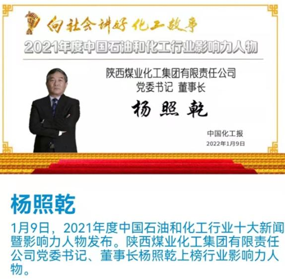 2022年1月9日,由中國石油和化學工業聯合會指導,《中國化工報》社有限公司主辦的“2021年度石油和化工行業十大新聞暨影響力人物發布盛典”采用線上直播的形式舉行。陜煤集團黨委書記、董事長楊照乾榮膺“2021年度中國石油和化工行業影響力人物”。發布盛典上,同時發布了《2021年度石油和化工行業責任關懷輿情報告》和2021年度中國石油和化工行業企業公民楷模榜,北元集團和東鑫垣公司等50家企業上榜。2021年以來,楊照乾以超前管理、系統思維、戰略思維,帶領全體干部職工勇立行業前沿,以國有資本投資公司改革為契機,統籌推進三項制度和混...